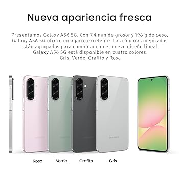لنز دوربینها در تمامی رنگها درون یک قاب مشکی رنگ قرار گرفتهاند و چیدمان زیرهم دارند. گلکسی a56 سامسونگ در رنگهای صورتی، سبز زیتونی، مشکی و خاکستری روشن در دسترس قرار گرفته و قابل خرید است.